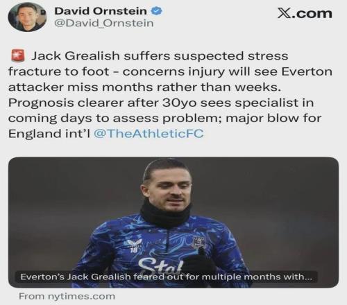 北京時間1月21日,據《The Athletic》記者大衛·奧恩斯坦報道,曼城外租球員,現效力于英超埃弗頓隊的格拉利什出現足部應力性骨折,可能缺陣數月而非數周。而《每日郵報》預計,格拉利什將傷停8周左右的時間。此前,格拉利什一直在為躋身英格蘭世界杯大名單而努力,如今他的世界杯夢想可能因傷提前宣告破滅。