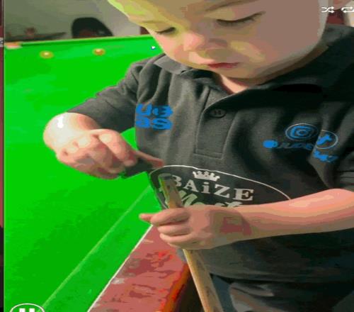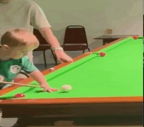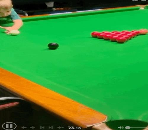 畫面很詭異,孩子甚至沒斯諾克球臺高,只能爬凳子上玩;結果他手上功夫甚至要令不少成年人汗顏。
