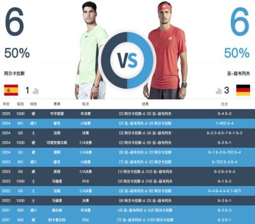 回看兩人過往的交鋒史,雙方各勝六場(chǎng)看似旗鼓相當(dāng),但這似乎也包含了不小的迷惑性。因?yàn)樵谖靼嘌廊嘶鹆ψ顬閮疵偷?025賽季,兩個(gè)人僅在辛辛那提大師賽半決賽有過一次交鋒,那場(chǎng)比賽面對(duì)已經(jīng)升級(jí)到2.0版本的阿爾卡拉斯,茲維列夫談不上有太多機(jī)會(huì)。6-4 6-3的比分也只是數(shù)據(jù)上的體面。