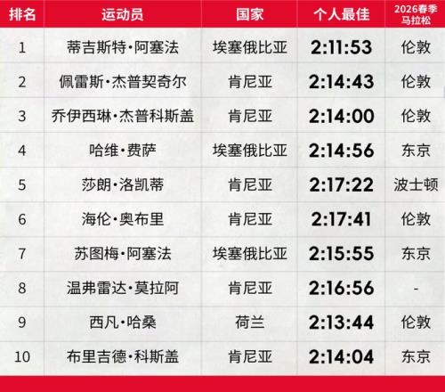 除了倫敦馬拉松,2026年東京馬拉松上,蘇圖梅·阿塞法·凱貝德將重返東京。這位衛冕冠軍兼兩屆冠軍將迎戰哈維·費薩,后者在2025年跑出了世界第三快的馬拉松成績,贏得了芝加哥馬拉松。其他著名選手包括2025年柏林馬拉松冠軍羅斯瑪麗·萬吉魯、2024年瓦倫西亞馬拉松冠軍梅格圖·阿萊穆,以及前馬拉松世界紀錄保持者布里吉德·科斯蓋。
