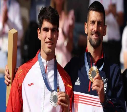 在2023年溫網(wǎng)的草地上,20歲的少年執(zhí)拍截斷了德約科維奇年度全滿貫的神話;次年再度于此終結了對方25冠的旅途。而37歲的GOAT,在2024年巴黎夏日的五環(huán)旗下?lián)敉税⒖ǎ瑢⒛敲丢毴钡慕鹋茖懭胧吩姟?/p>